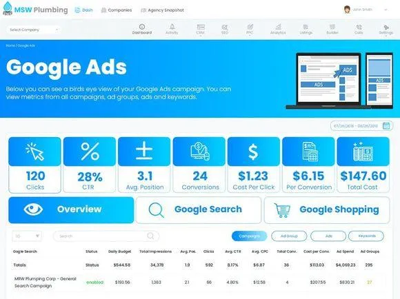Reports are all done using Google Data Studio using real time data downloaded from Google Ads and Facebook Ads. We have formatting that is ready to go or can create a more custom one based on your client's preferences.